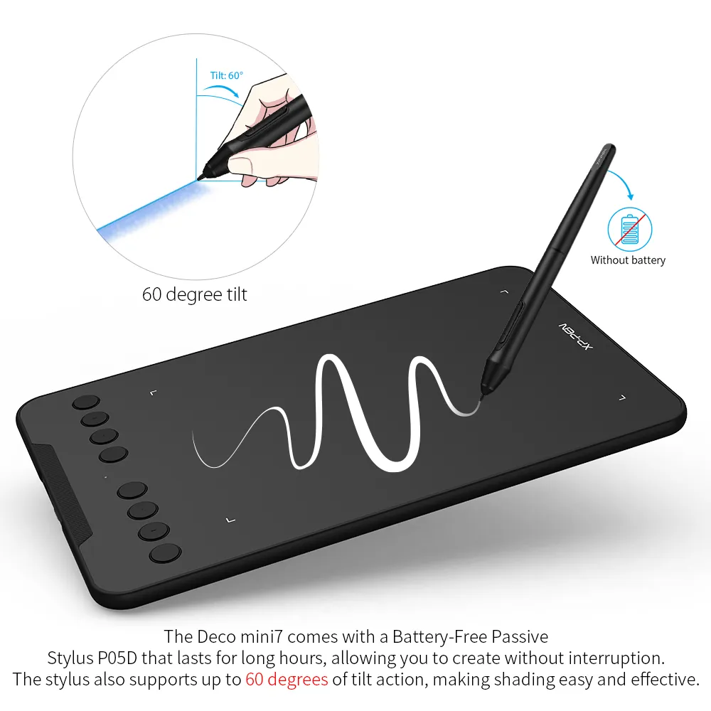 The Deco mini7 comes with a Battery-Free Passive Stylus P05D that lasts for long hours, allowing you to create without interruption. The stylus also supports up to 60 degrees of tilt action, making shading easy and effective.