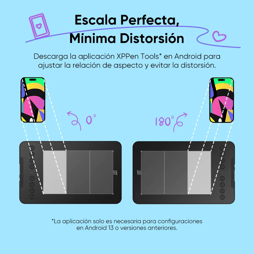 Descarga la aplicación XPPen Tools* en tu dispositivo Android para ajustar manualmente la relación de aspecto y evitar la distorsión de imagen. También puedes rotar la tableta 180° para adaptarla tanto a usuarios diestros como zurdos.