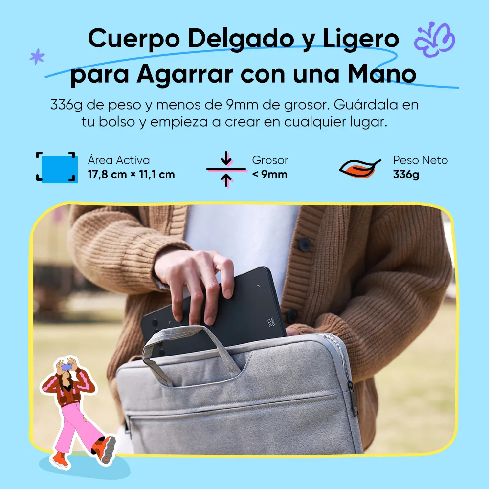 Pesa solo 336g y tiene menos de 9mm de grosor, tan delgada como un teléfono inteligente. Puedes guardarla fácilmente en tu bolso y empezar a crear en cualquier lugar.