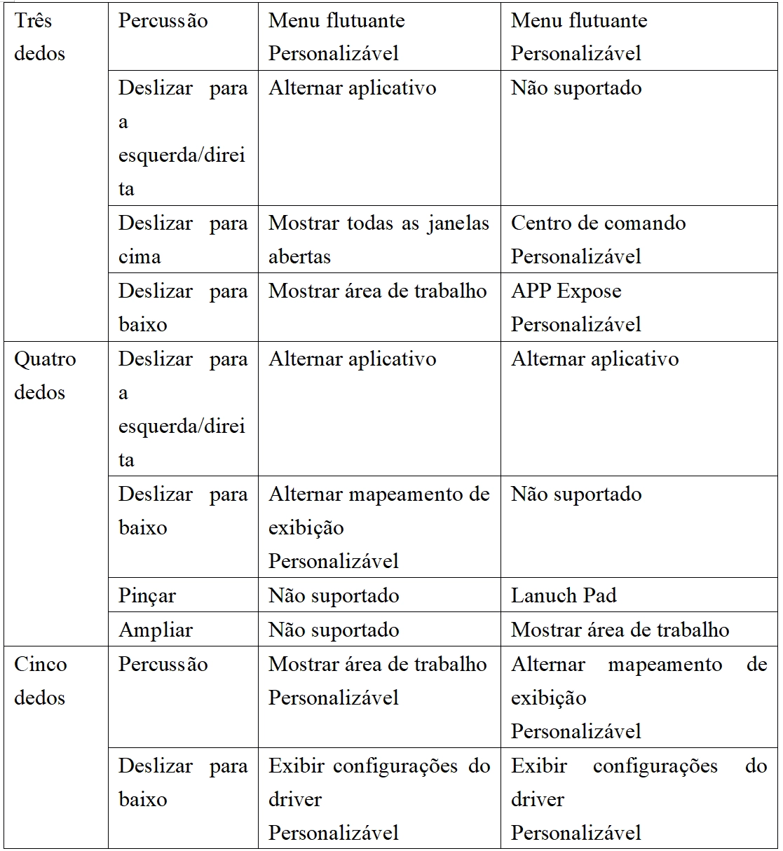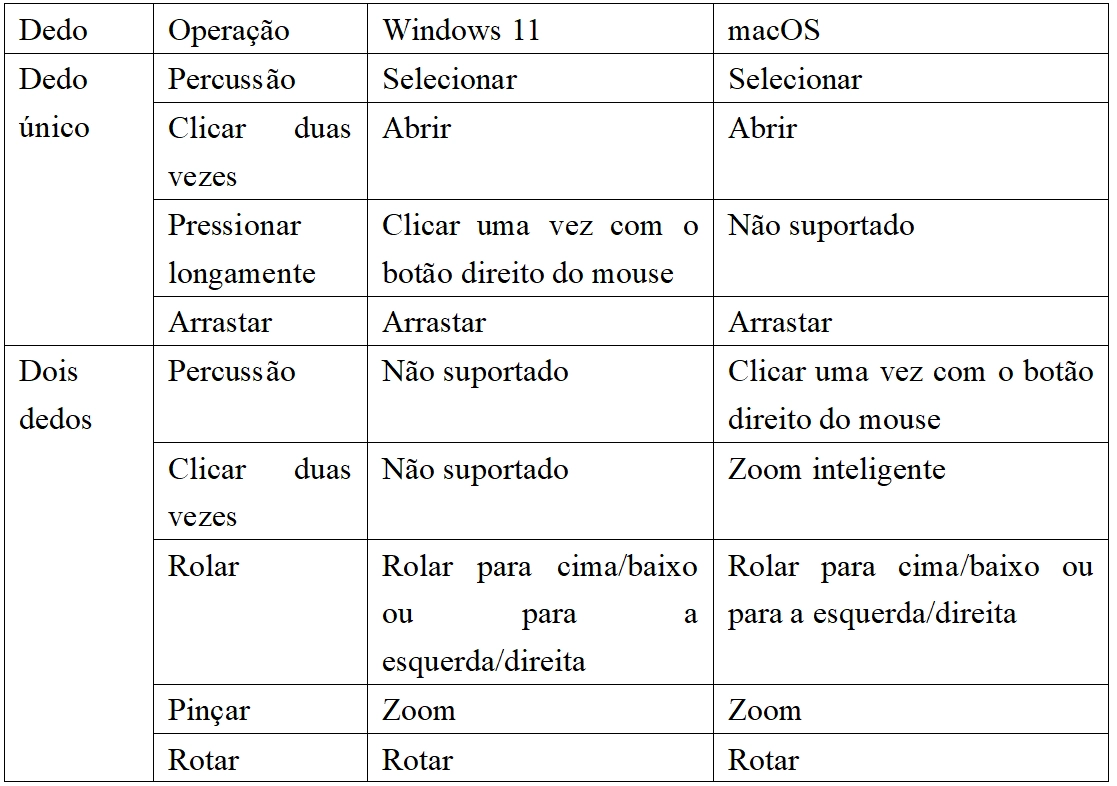 Observação: alguns gestos padrão do sistema podem não ser suportados devido a diferentes versões do sistema operacional.