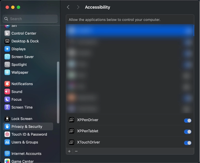 Extraia e execute o arquivo “.pkg”. Siga as instruções para concluir a instalação. Em seguida, adicione as configurações de segurança necessárias (Preferências do Sistema -> Privacidade e Segurança -> Acessibilidade). Após a autorização e o desbloqueio, certifique-se de que as opções XPPenDriver, XPPenTablet e XTouchDriver estejam marcadas; caso contrário, o dispositivo e o driver podem não funcionar corretamente.