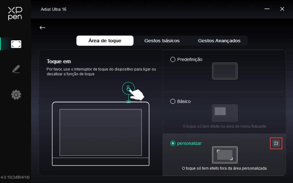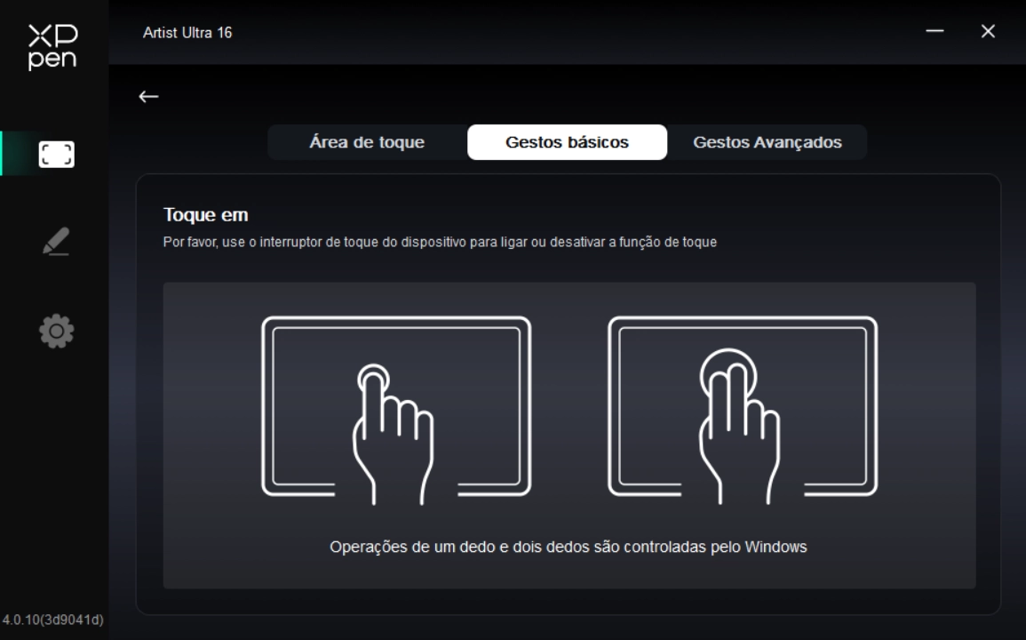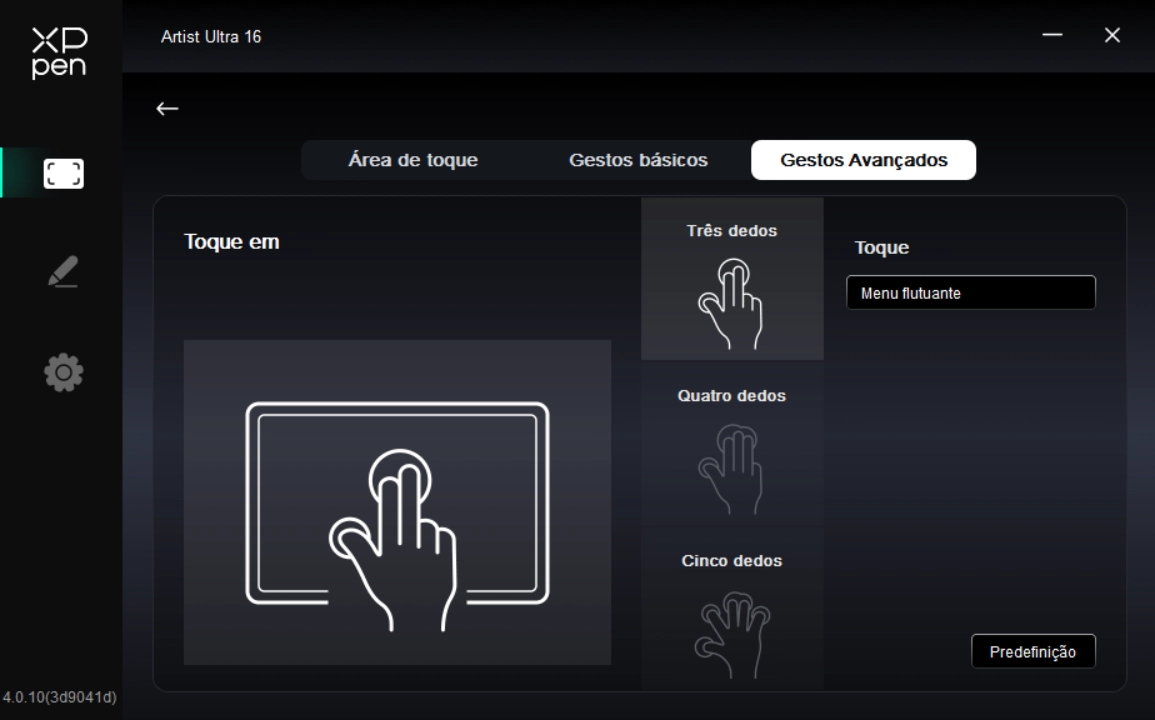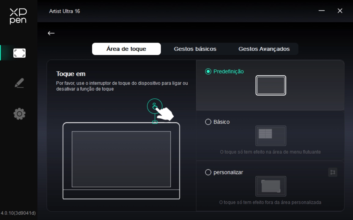 O Artist Ultra 16 suporta a função de toque com vários dedos para aumentar a eficiência criativa por meio da operação por gestos, e você pode optar por ativar ou desativar a função de toque usando o botão de toque superior.