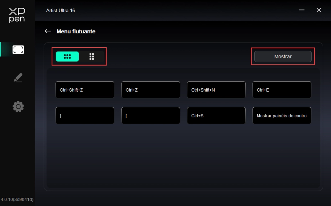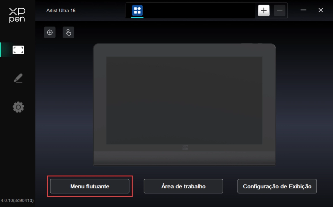 O menu flutuante permite exibir teclas de atalho flutuantes na tela digitalizadora ou no monitor do computador. É possível configurar operações usadas com frequência no menu flutuante e, em seguida, usar a caneta stylus, o mouse ou o toque para clicar no botão e executar as operações configuradas. Você pode personalizar a tela e as funções clicando no botão "Menu flutuante" na página inicial do driver para acessar a página do menu flutuante.