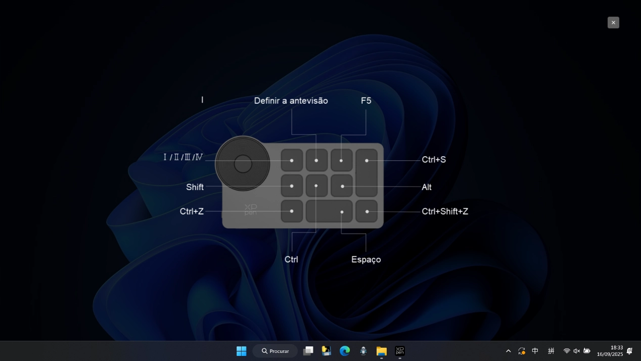O botão no meio da roda pode ser usado para alternar entre os vários grupos de funções da roda. O driver oferece quatro grupos de funções de roda: zoom (padrão), rolagem, pincel e rotação.