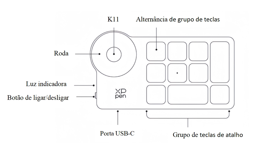 1. Ative o botão de ligar/desligar do teclado de atalho sem fio, a luz indicadora do teclado sem fio pisca lentamente em azul, pressione longamente a tecla K11 por 6 segundos para entrar no estado de emparelhamento, a luz indicadora pisca rapidamente em azul
