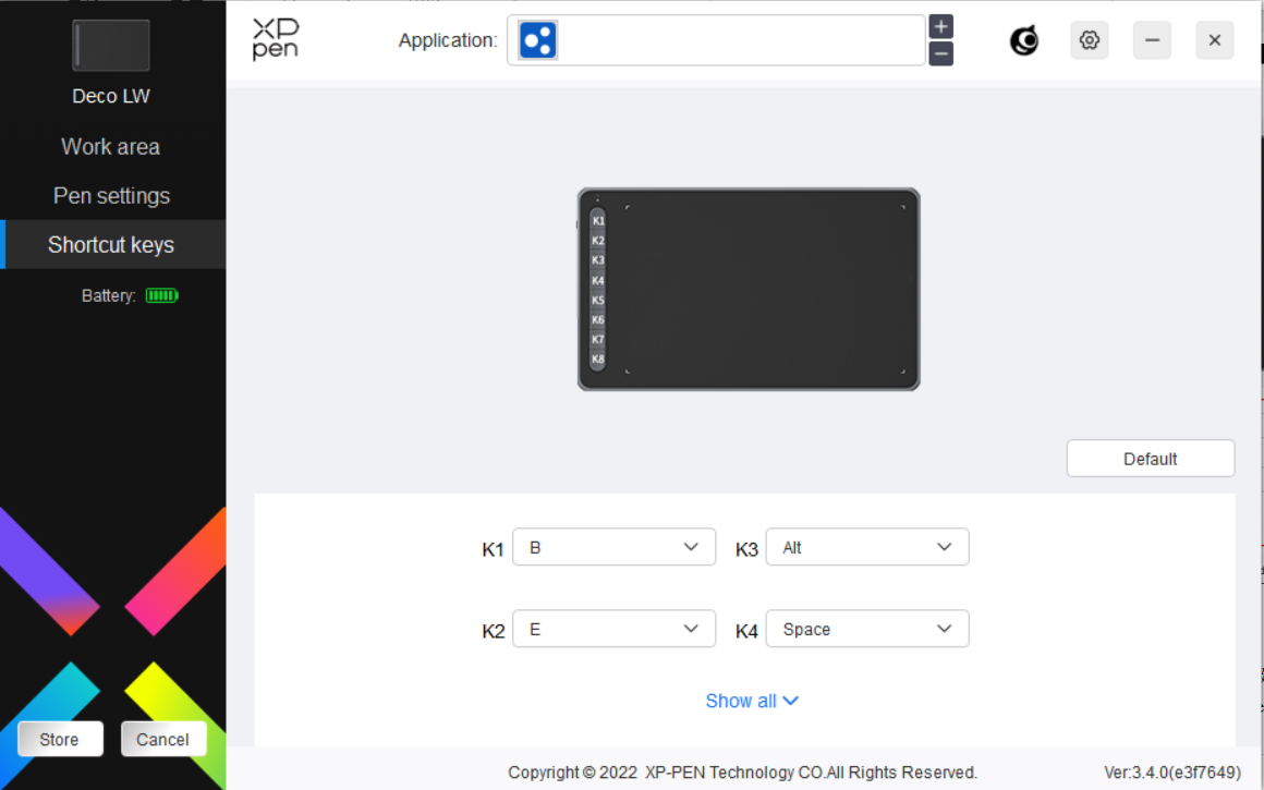 Seleciona um aplicativo da lista de aplicativos no topo do driver, marque a aplicativo, e depois customize as suas teclas da caneta, teclas de atalho e funções de roda do rato/toque.