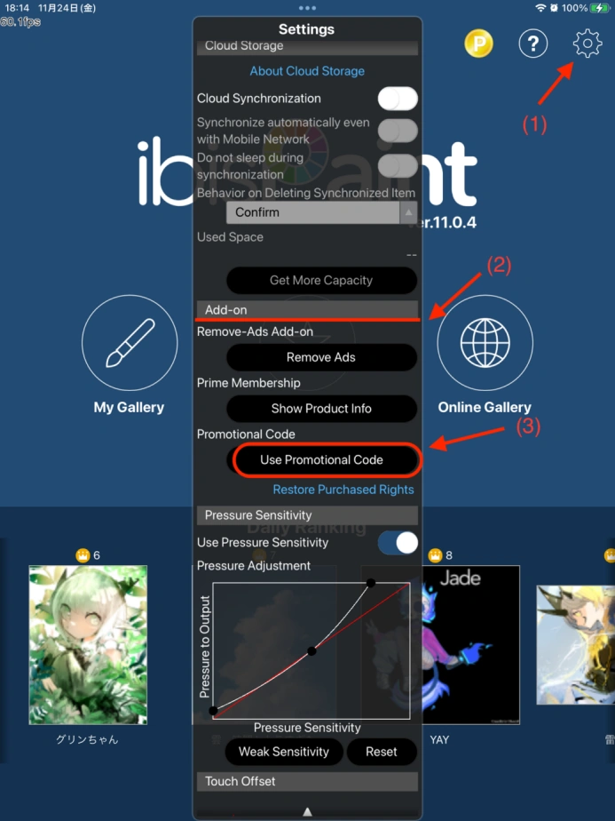 1. Na tela de título do aplicativo, toque no botão Configurações (1) e role para baixo para encontrar a seção Add-on (2). Toque no botão Usar código promocional (3).
