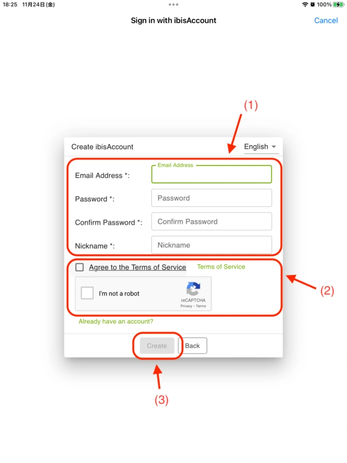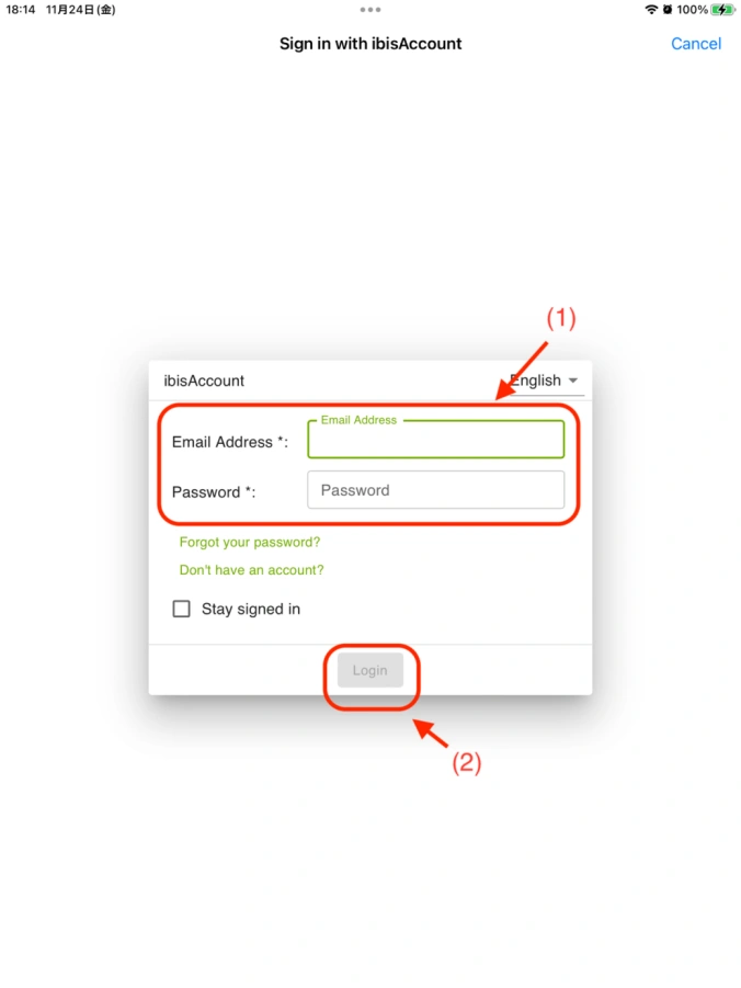 4. No aplicativo ibisPaint (não no seu aplicativo de e-mail), você precisa novamente fazer login com ibisAccount. Após concluir a etapa de verificação, insira seu endereço de e-mail e senha (1) e toque no botão Login (2).