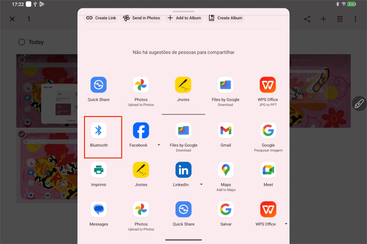 3. Selecione o arquivo a ser transferido no tablet e escolha "Bluetooth" para compartilhar, conforme mostrado abaixo.