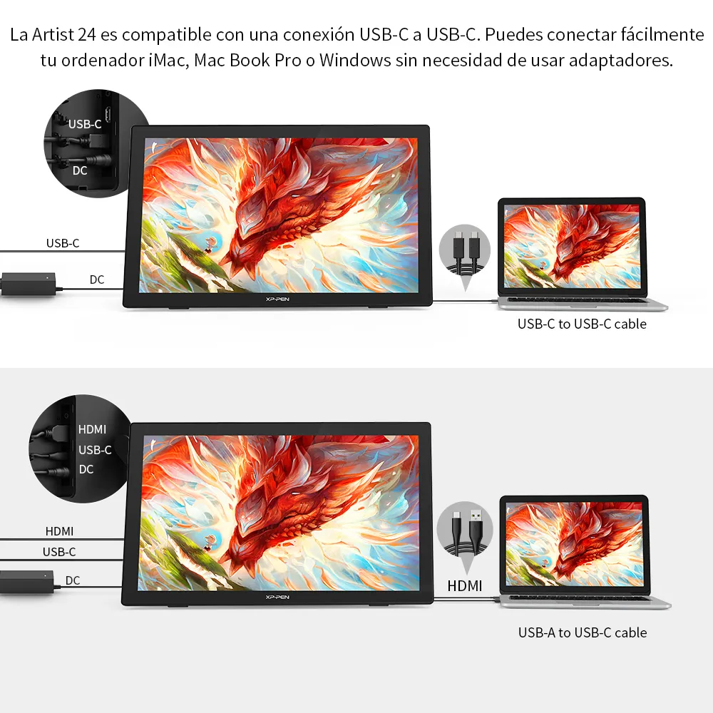 La Artist 24 es compatible con una conexión USB-C a USB-C. Puedes conectar fácilmente tu ordenador iMac, Mac Book Pro o Windows sin necesidad de usar adaptadores.