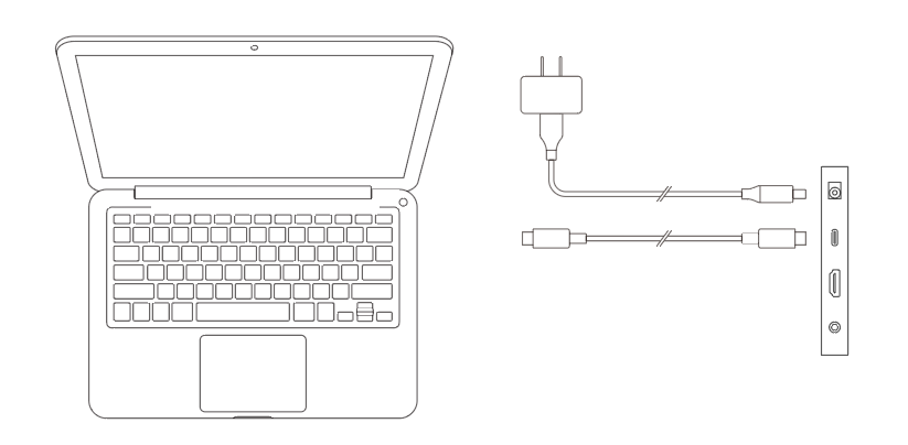 Jak pokazano na poniższym rysunku, podłącz kabel HDMI do portu HDMI w komputerze oraz wyświetlacza graficznego, aby przesyłać sygnały wideo. Dodatkowo podłącz kabel USB-C do USB-A lub kabel USB-C do USB-C do portu USB w komputerze oraz wyświetlacza graficznego, aby przesyłać sygnały danych.