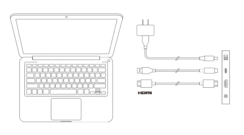 As illustrated in the figure below, connect the HDMI cable to the HDMI port on your computer and the drawing display to transmit video signals. Additionally, connect either the USB-C to USB-A cable or the USB-C to USB-C cable to the USB port on your computer and the drawing display to transmit data signals.