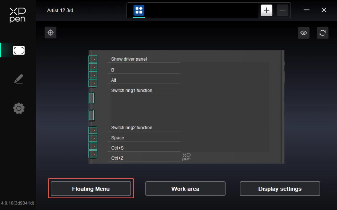 The floating menu can display floating shortcut keys on the drawing display or computer monitor. You can set common operations on the floating menu. Then tap the button with your stylus or mouse to perform the set operation. To customize the display and features of the floating menu, click the Floating Menu button on the driver's homepage.