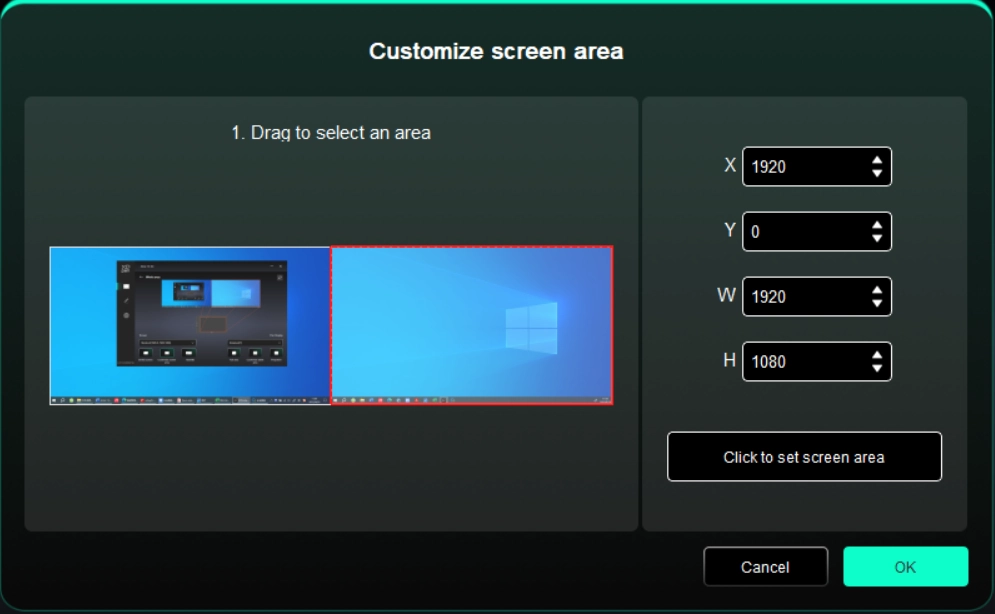 Click Mode: Click the Click to Select Screen Area button. Then, on the monitor screen, click the upper-left and lower-right corner positions to be selected;
