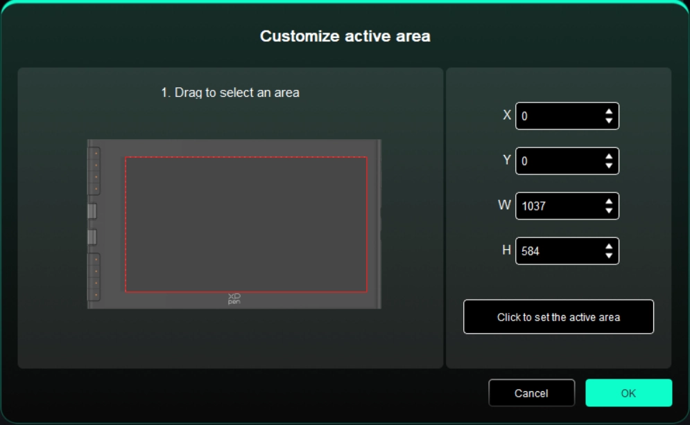 Click Mode: Click the Click to Select Tablet Area button. Then, on the drawing display's work area, use your stylus to tap the upper-left and lower-right corner positions to be selected;