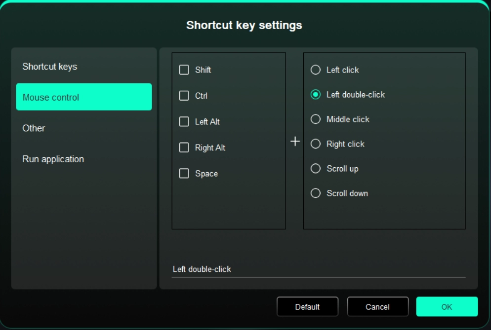 Set mouse and keyboard combinations. For example, selecting Shift + Click enables this shortcut in supported applications.