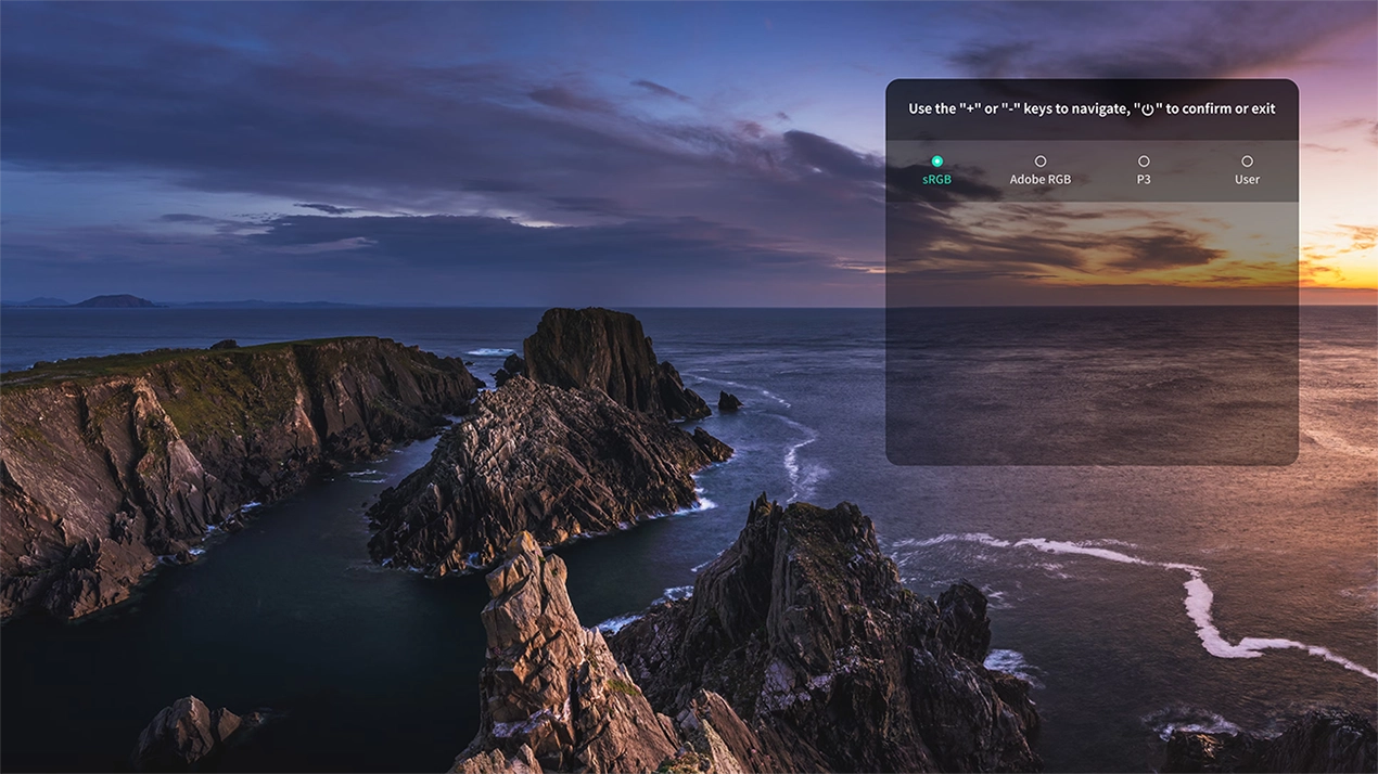Press the brightness “+” or “–” button to navigate and select the color space. Press the Power button to confirm or exit.
