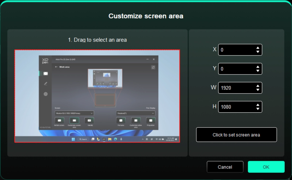 Click to set screen area: Click the upper left corner position and lower right corner position to select on the monitor.
