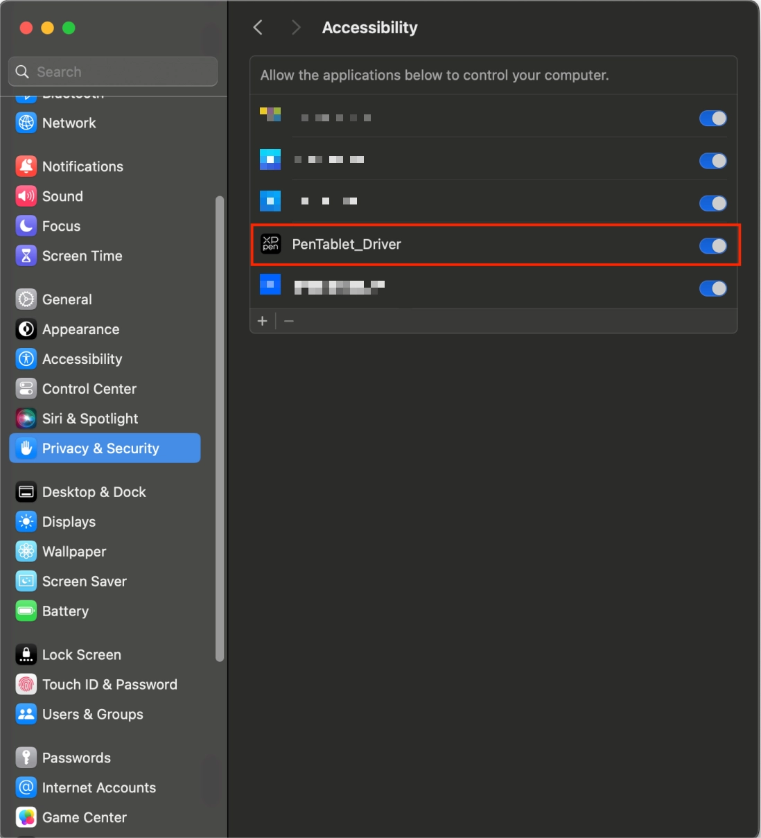Unzip file, run the "pkg" file and follow the prompts to complete the installation. Go to System Settings -> Privacy & Security -> Accessibilitiy, please ensure that the PenTabletDriver option is checked; Otherwise, the device and driver may not function properly.