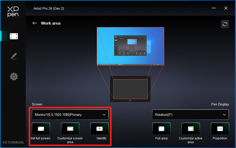 If multiple monitors are used in extend mode, go to monitor tabs to select one of the monitors that the work area of the device will be mapped to.