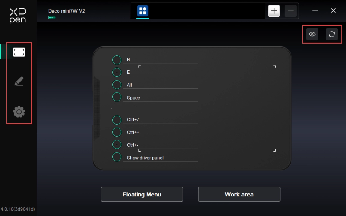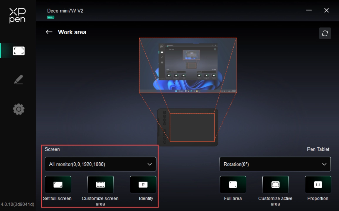 1) By default, the tablet orientation is 0°, and the drawing area is on the left. You can set the drawing area on the left, center, and right.