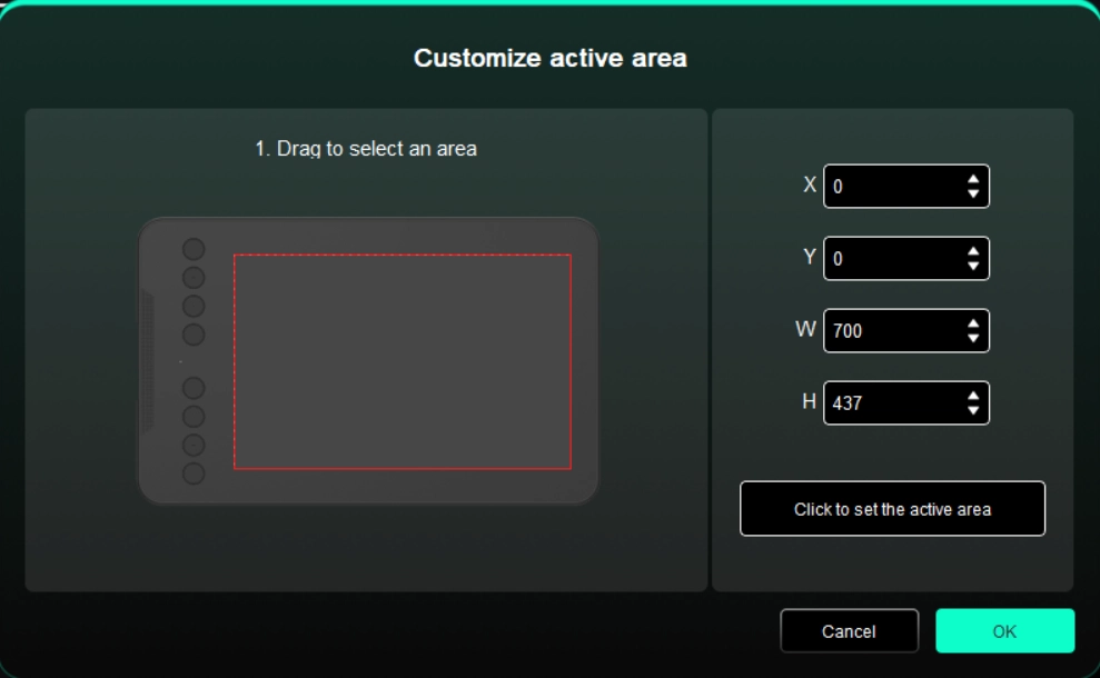 Click Mode: Click "Click to Select Tablet Area" button. Then, on the drawing display's work area, use your stylus to tap the upper-left and lower-right corner positions to be selected;
